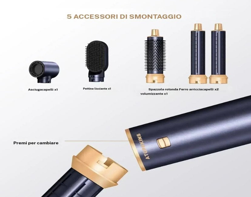 Il kit include cinque accessori intercambiabili che ti permettono di asciugare, lisciare, dare volume e arricciare i capelli. In genere, un multistyler di questo tipo include: due arricciacapelli a barilotto (per diverse direzioni di styling), una spazzola lisciante, una spazzola volumizzante e un concentratore (o pre-styler).